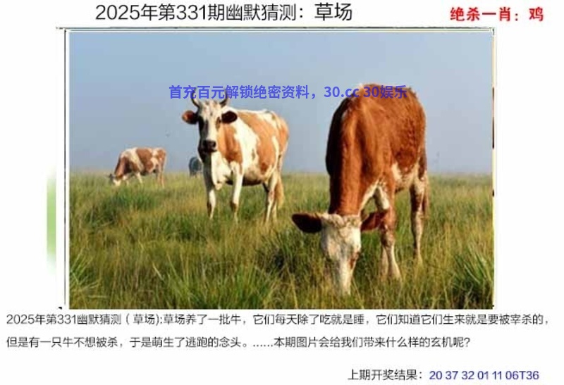 331期图片猜测(草场)【开:龙26】 草场养了一批牛,它们每天除了吃就是睡,它们知道它们生来就是要被宰杀的,但是有一只牛不想被杀,于是萌生了逃跑的念头。......本期图片会给我们带来什么样的玄机呢? 解:明肖牛,草场,解草肖牛羊马兔幽默猜测推荐六肖:牛龙羊马兔狗点击注册30.cc娱乐城3090.com大额无忧 |